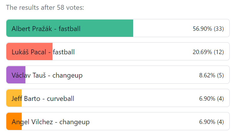 A Jak to dopadlo minule? Armáda fanoušků Alberta Pražáka zcela jasně rozhodla v jeho jednoznačné vítězství, 33 hlasů pro jeho fastball je zatím nejvíc hlasů v krátké historii naší ankety!