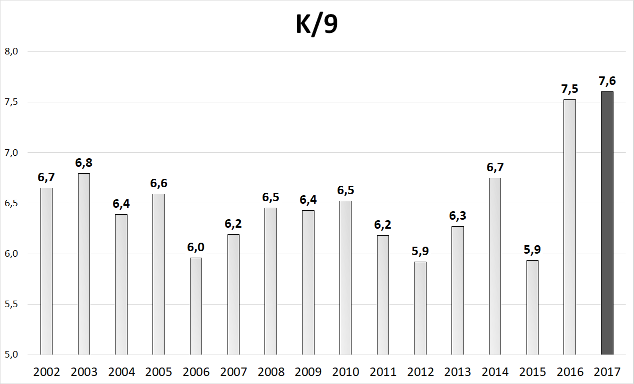 Už možná vidíte, že se blížíme k rozuzlení. Sezona 2017 byla nejlepší co se týká strikeoutů průměrně za 9 směn. Nadhazovači hodili průměrně 7,6 strikeoutů za zápas, čímž o jednu desetinu překonali rekord ze sezony 2016. Dobrá, říkáte si, proč ale najednou ubylo tolik homerunů, když strikeouty mezi roky 2016 a 2017 zůstali na téměř stejné úrovni?