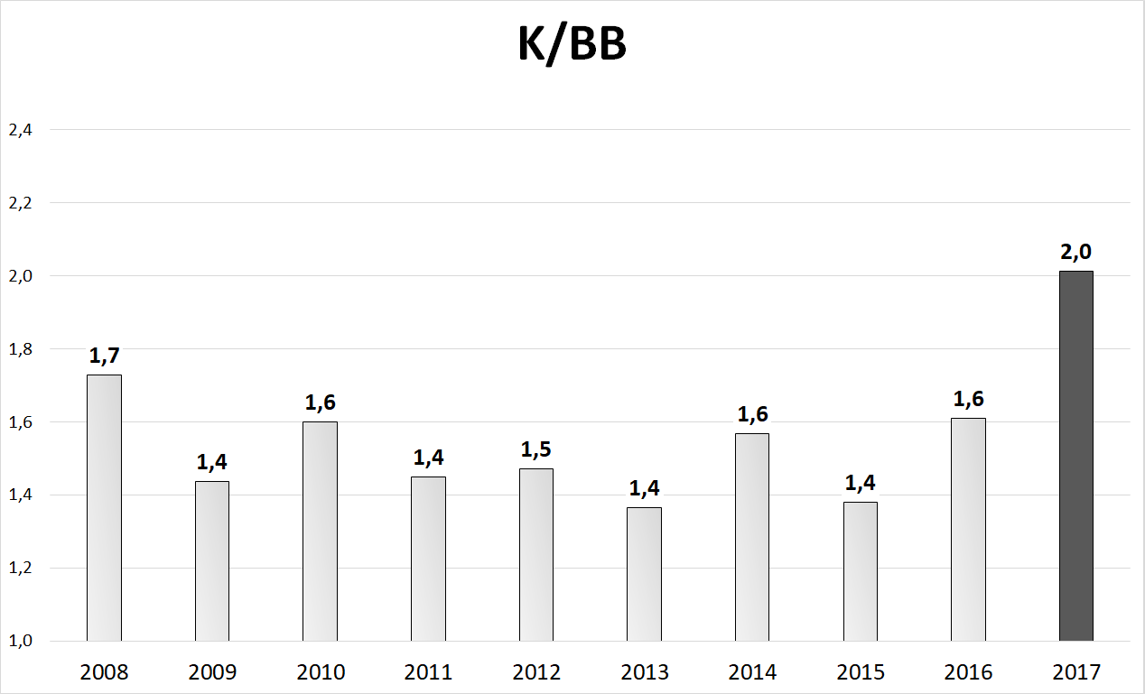 Odpověď se dá, myslím, vyčíst z posledního grafu. Tento graf vyjadřuje poměr strikeoutů a met zdarma za sezonu. A opět tu máme další rekord! Na jednu metu zdarma připadly v loňské sezoně přesně 2 strikeouty. To naznačuje, že výrazně vzrostla kvalita nadhozů, nadhazovači byli v roce 2017 nebývale přesní a zároveň efektivní. Když už pálkaři dostali nějaký nadhoz dobrý k odpálení, velmi často jej promáchli nebo jejich odpal nebyl dost dobře trefený a obrana jej dokázala lehce zachytit a proměnit v out.