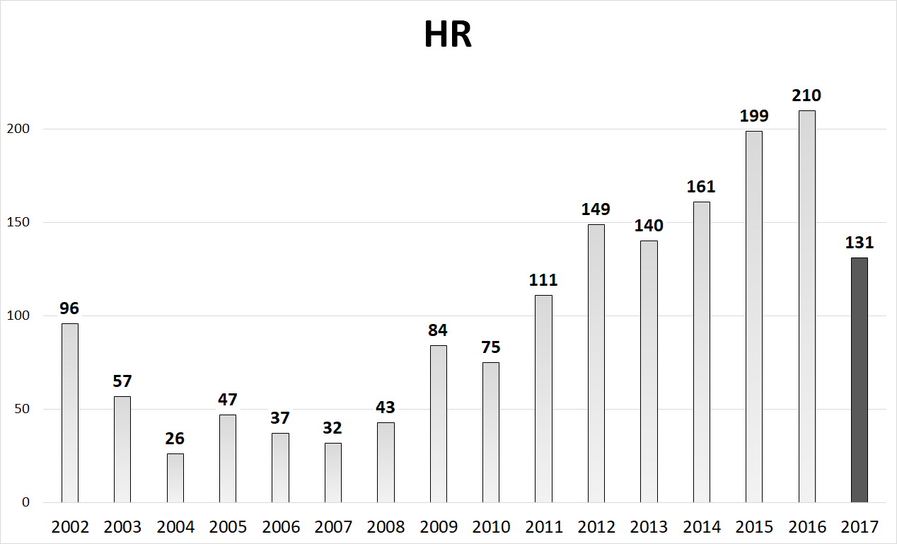 Zde je vidět počet homerunů odpálených celkem v základní části extraligy, opět od roku 2002. I zde je vidět strmý pokles, jde o nejnižší číslo za šest let. Je pravda, že například Kotlářka před letošní sezonou přišla o trojici bomberů Nilsson - Mužík - Battaglia, kteří dali v roce 2016 celkem 35 z 58 homerunů Kotlářky. I kdybychom ale tyto hypoteticky ztracené homeruny přičetli k těm 131 HR z letošní sezony, stále budeme hluboko pod úrovní roku 2016, zvláště když si uvědomíme, že kvůli rozšíření extraligy dvěma nováčky se letos hrálo o 40 zápasů více než vloni.