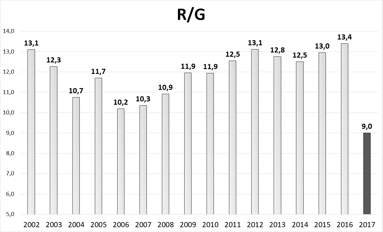 Ač se to možná na první pohled nezdá, extraligová sezona 2017 byla z pohledu statistik diametrálně odlišná od sezony 2016 a od všech předchozích sezon. Dalo by se říct, že ročník 2017 byl až historicky vyjímečný. A tím nemyslím jen změnu hracího systému a zavedení nadstavby playoff. Podívejte se na následující graf: