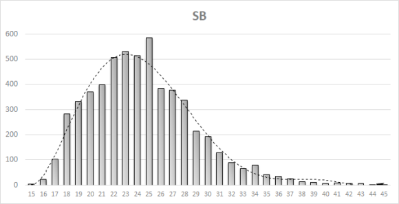 Graf ukazuje počet ukradených met v české extralize podle věku hráčů a je z něj zřetelně vidět, že vrchol v rychlosti běžců přichází už daleko dříve, než na pálce, zhruba ve věku 22 až 25 let. Navíc, po tomto vrcholu sprinterská rychlost celkem rapidně klesá a po pětatřiceti už hráči téměř žádné mety nekradou. Je to tím, že výbušnost mizí z lidských svalů už někdy po 25. roce života. Důvody, proč naše těla postupem času ztrácejí na výkonnosti, jsou na složitější vysvětlení, kterého zde nejsem schopen (hezky je to popsáno například zde).