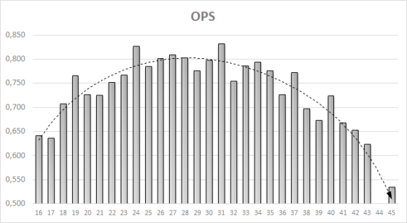 Každý jistě i ze sledování jiných sportů jistě tuší, že někdy po třicítce výkonnost sportovců klesá. V baseballu však máme velkou výhodu v tom, že známe statistiky hráčů po celou jejich kariéru a můžeme podrobně sledovat jejich vývoj v čase. Vězměme si například statistiku OPS, což je součet statistik OBP a SLG, tedy procentuální úspěšnosti v dostávání se na mety a délce průměrného odpalu. Hráči s nejvyšším OPS trefují míčky často a tvrdě. Je to tedy ideální ukazatel pro rychlé a jednoduché posouzení kvality pálkařů.