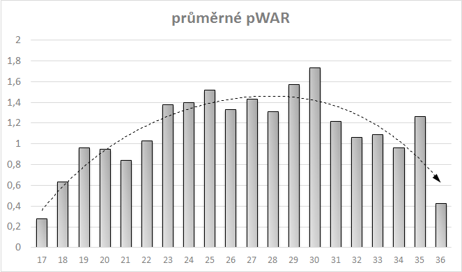 A jak jsou na tom nadhazovači? V podstatě stejně jako pálkaři. Vrchol jejich kariéry podle WAR (tedy užitečnosti pro tým) přichází mezi 25. až 30. rokem života: